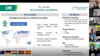 En el caso de México, Iris Cureño, jefa de la Unidad de Seguimiento y Evaluación de Proyectos Prioritarios de la CFE, expuso los esfuerzos nacionales para integrar el hidrógeno verde en la matriz energética del país. Aunque México ha avanzado con proyectos como el PRODESEN 2024-2038, que prevé una conversión significativa al uso de hidrógeno verde en combinación con el gas natural, aún se enfrenta a retos como la falta de una normativa clara y la necesidad de una infraestructura adaptada.